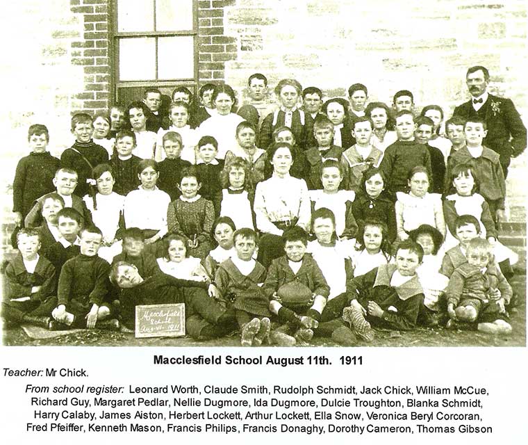 The year 1914 brought not only the outbreak of war, but the terrible bush fires following a severe drought. Macclesfield was in danger and people prepared to leave in any way they could. The fire eventually reached Mt Dennis and appeared on the summit and all hope seemed gone. Then the miracle happened, the wind changed and sent the flames along the top of the range, instead of down on to the town. I can see those flames still.